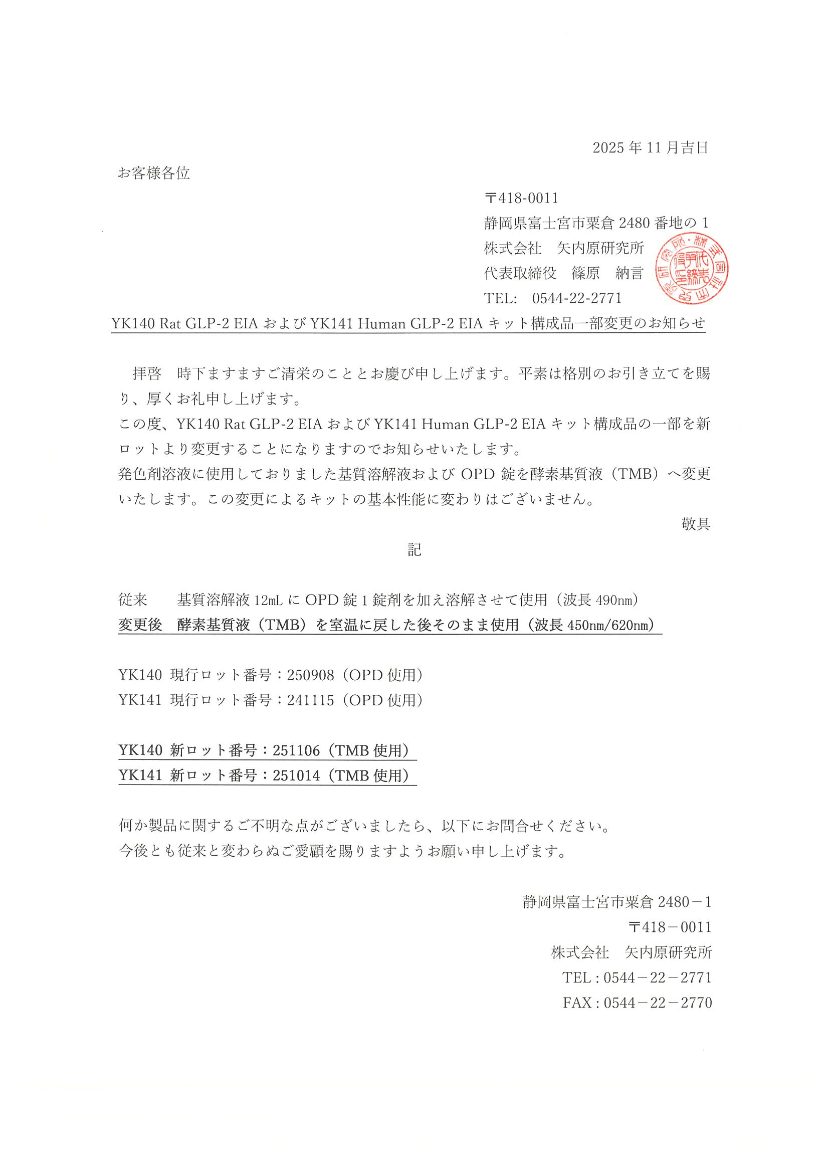 YK140 Rat GLP-2 およびYK141 Human GLP-2 EIA キット構成品一部仕様変更のお知らせ
